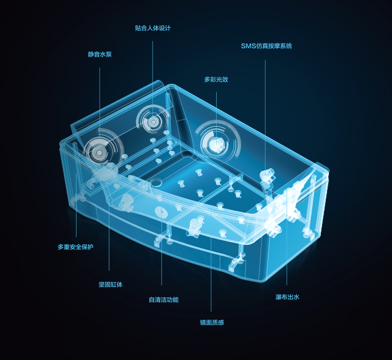 缸體機構依據中國人的體態特征, 運用人體工程學設計, 無論坐或躺都舒適感極佳。 節水管理,優化水道設計,可節水高達20%。