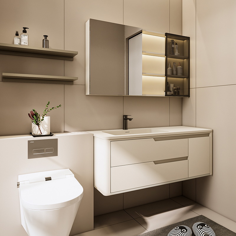 主柜顏色:月牙石 臺盆顏色:月光石 材質:多層板/奇美石/智能鏡 安裝方式:掛壁安裝